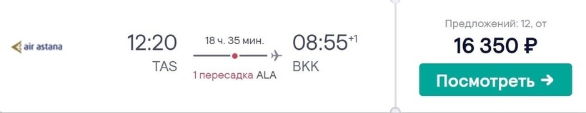 В столицу Таиланда можно попасть со стыковками. По времени авиапутешествие выйдет дольше (от 9 часов). Air Astana доставит до конечного пункта за 16–18,5 часа (в зависимости от дня недели). Билет только туда — от 16300 рублей (за месяц до вылета).