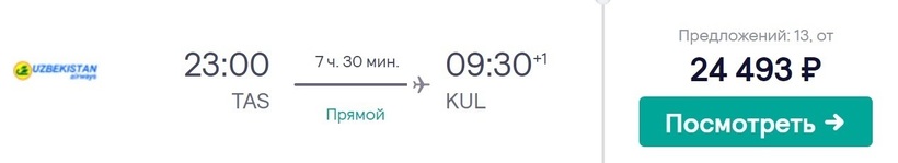 Malindo Airways (OD 752) Boeing 737-800 | 23:10 Ташкент (TAS) | 8 ч. 30 мин | 10:40 Куала-Лумпур (KUL) | 17, 21, 24 октября, 3, 6, 10, 13, 17, 20, 24, 27 февраля, 3, 6, 10, 13, 17, 20, 24, 31 марта, 3 апреля, … |