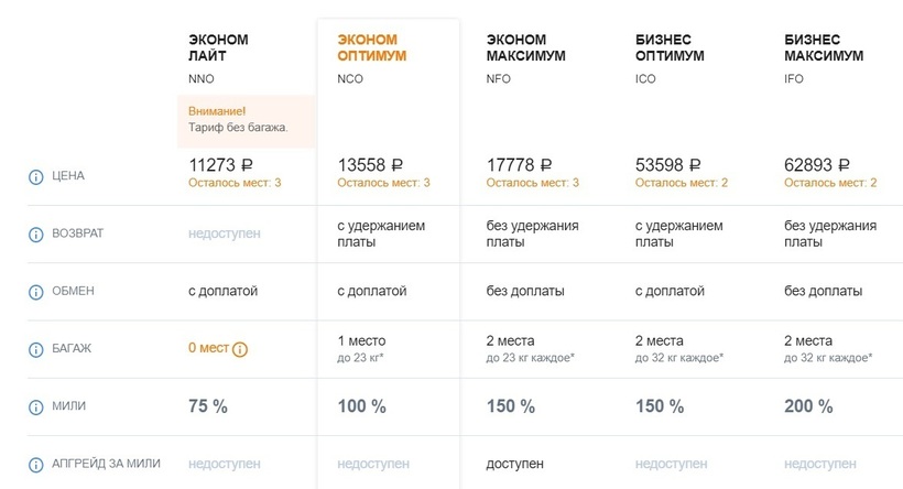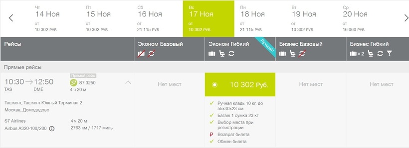 S7 менее популярная компания, потому что рейсы не ежедневные. Купить авиабилет за неделю до поездки можно за 10300 рублей (обратный будет стоить столько же). Тариф один — «Гибкий». По его условиям разрешается взять ручную кладь (10 кг), багаж (до 23 кг).