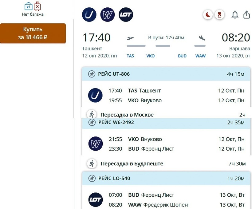 Путешественникам, которые хотят максимально сэкономить, могу рекомендовать полет с двумя самостоятельными пересадками. Например, преодолеть маршрут можно за 17,5 ч. (включая стыковку в 2 ч. в Москве и 7,5 ч. в Будапеште) с компаниями Utair, Wizz Air и LOT. Билет с ручной кладью обойдется всего от 18500 ₽.