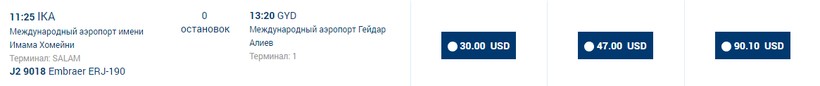 Это азербайджанский лоукостер, его преимущество — низкая стоимость авиабилетов. Единственный оператор, который осуществляет прямые рейсы по маршруту. В расписании имеется один ночной вылет до Баку, он ежедневный. Самолет долетает всего за полтора часа.