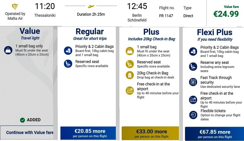 На летне-осеннее время цены возрастают до 4000–5700 ₽ (50–70 €) в одну сторону, поэтому на этот период рекомендую купить авиабилеты заранее. Но поскольку минимальные тарифы у Ryanair невозвратные, оформлять перелет за большой срок до даты отправления лучше по тарифу Flexi Plus. Правда, стоимость по данному тарифу будет выше на 5500 ₽ (68 €). Бизнес-класса у лоукостера нет, самолеты небольшие, питание и напитки за дополнительную плату.