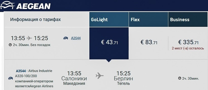 | Aegean Airlines (A3 512) Airbus А320 | 13:15 Салоники (SKG) | 2 ч. 25 мин | 14:40 Берлин (BER) | вс с 29.03 |
