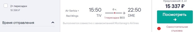 Например, можно совершить авиапутешествие через Белград с Air Serbia (выполняется совместно с Montenegro Airlines) и Red Wings. Общее время в пути — 6 ч. На стыковку дается 2,5 ч. Аэропорт в столице Сербии небольшой, но тут есть все необходимое: аптеки, магазины, комнаты матери и ребенка, банкоматы (на первом этаже). Билет за день до вылета можно купить за 15500 рублей. Рейс подразумевает самостоятельную стыковку. Вам нужно будет заново пройти регистрацию, паспортный контроль и досмотр. Также не забудьте забрать свой багаж, если он у вас будет, конечно.
