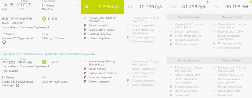 Общее время в пути — 17,5 ч. Пересадка в Красноярске, ее продолжительность 14 часов. Один из самых быстрых способов добраться до конечного пункта — выбрать в качестве авиаперевозчика S7. Одна из крупнейших российских а/к сможет доставить до Читы за 14 часов. На пересадку в Новосибирске (аэропорт называется Толмачево) отводится 10 ч. Теперь про стоимость билетов. За пару недель их можно приобрести за 12700 рублей. Если будете бронировать за месяц, то авиабилеты можно приобрести дешевле — от 9200 рублей.