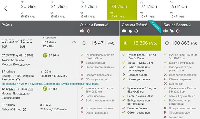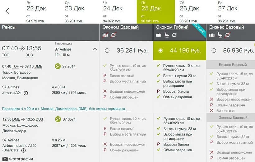 Рейсы Томск — Дюссельдорф осуществляет только одна авиакомпания - Сибирь. Минимальная стоимость билета составит 25 633 рублей.