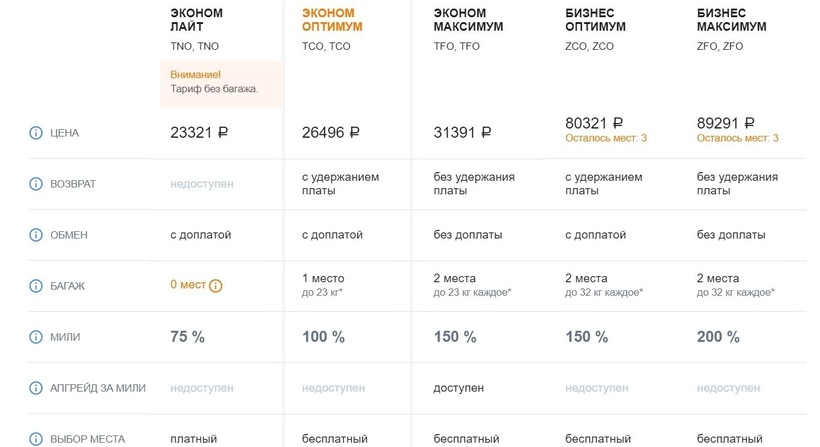 Этот тариф с минимальными опциями, включена только ручная кладь, ее ограничения по весу — 10 кг. Плюс билет нельзя сдать и выбрать бесплатно место в салоне тоже нельзя. Заплатив на 3000 рублей больше, сможете взять тариф «Оптимум». Согласно его условиям в багаж можно сдать 1 чемодан (до 23 кг). Самый продвинутый тариф в линейке экономкласса называется «Максимум». Его преимущества: