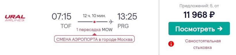 Еще из Томска в Прагу можно попасть с «Аэрофлотом» и Czech Airlines (национальная а/к Чешской республики). Длительность одного из самых удобных перелетов со стыковкой в Шереметьево (3 ч.) — 10 ч. У авиаоператоров нет договоренности о пересадке, и стыковка в аэропорту будет самостоятельной. Объясню: нужно забрать багаж (при его наличии), зарегистрироваться на рейс до Праги, пройти процедуры паспортного контроля и таможенного досмотра. Стоимость билета за неделю только туда от 18300 рублей. Обратный обойдется примерно в такую же сумму.