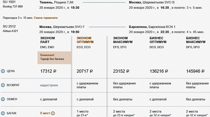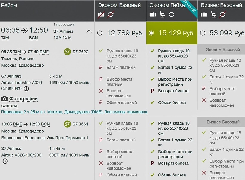 Я чаще выбираю полет с S7, потому что билеты у компании дешевле — только туда с багажом можно купить за 15500 ₽. В обе стороны авиаперелет обойдется от 28500 ₽. Преодолеть весь маршрут в бизнес-классе с этим оператором не получится, потому что он предлагает полет в данном классе только на отрезке пути Москва — Барселона. До российской столицы лететь придется в классе эконом. Такой вариант авиапутешествия стоит от 53000 ₽.