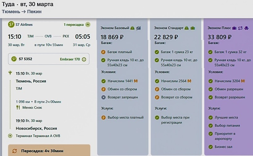 S7 Airlines хоть и незначительно, но проигрывает «Аэрофлоту» по расписанию полетов, так как выполняет всего по одному рейсу в день. Самолеты летают через Новосибирск, с пересадкой в 4,5 часа авиапутешествие длится 11 ч. Уступает S7 и по стоимости билетов с багажом: туда можно купить примерно за 23000 ₽ (тариф возвратный), если бронировать места и в обратном направлении, это обойдется от 44000 ₽. Зато к плюсам данного перевозчика могу отнести то, что у него доступны тарифы только с ручной кладью, по которым перелет в одну сторону стоит приблизительно от 19000 ₽, туда-обратно — от 36000 ₽.