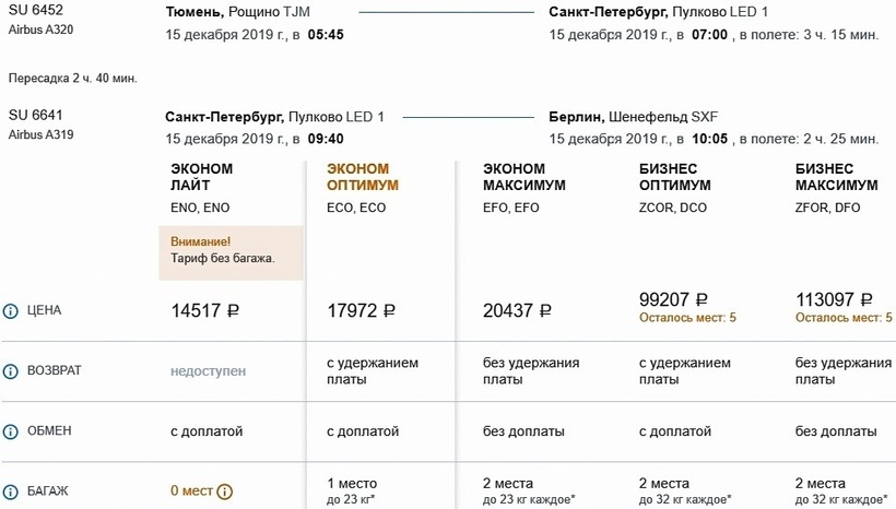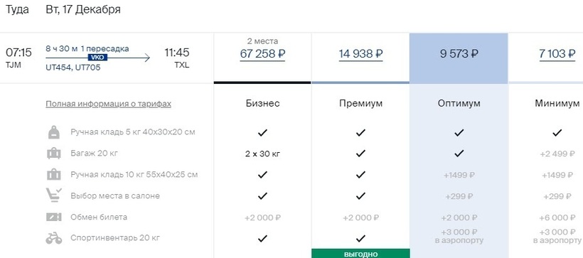 Стоимость действительна на ближайшие даты и на вылеты примерно в течение еще трех месяцев. На период с марта по октябрь цены увеличиваются на 2500–3500 ₽. Но даже в этом случае путешествие с «ЮТэйр» получается бюджетнее, чем с вышеупомянутыми компаниями. Полет без багажа у Utair дешевле примерно на 2500 ₽. Но покупать билеты по тарифу «Минимум» не рекомендую, так как у оператора разрешено провозить ручную кладь только до 5 кг. Прилетают самолеты также в Берлин-Тегель. Выполняются все авиарейсы из единственного тюменского аэропорта Рощино, что в 13 км от города. Доехать до места вылета можно за 40 минут на автобусе.