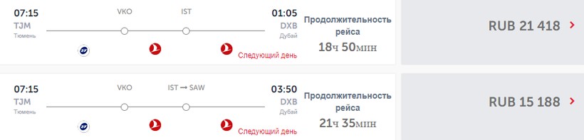 Также есть неплохой вариант, который займет несколько больше времени (21 час 30 минут), зато за него отдадите всего 15000 рублей. Только будьте внимательнее, в Стамбуле предстоит смена аэропорта, но на это у вас будет свыше 5 часов. По своему опыту скажу, что доехать из одного авиахаба в другой можно в среднем за пару часов. В обоих случаях вылеты стоят утренние, а прибытие в Дубай запланировано на ночь. Считаю очень удобным тот факт, что в самый дешевый тариф уже входит багаж. Обратите внимание, что полет выполняется совместно с Utair, но билет вы покупаете единый, он поможет избежать вам самостоятельной стыковки. Оплачивать его лучше заранее, хотя бы за несколько недель до отправления.