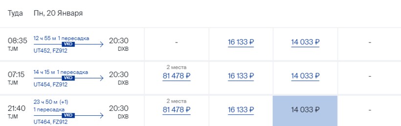 | ЮТэйр (UT 761) Boeing 737-800 | 08:45 Тюмень (TJM) | 5 ч. 30 мин | 13:15 Дубай (DWC) | 14 ноября |