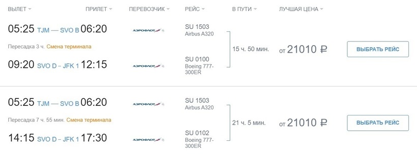 Через столицу РФ до места назначения можно долететь с «Аэрофлотом». Расписание полетов вполне удобное, выполняет авиаоператор ежедневно по девять транзитных рейсов. Все со стыковкой в Шереметьево. Время в пути разное — от 16 часов до 1 суток и 7 часов. Соответственно на пересадки отводится от 3 до 17 часов. В московском аэропорту вам нужно будет пройти предполетные процедуры — паспортный контроль и таможенный досмотр. Регистрироваться на следующий рейс до Нью-Йорка не нужно будет — полетите по единому билету. Теперь о ценах. Минимальная стоимость проездного документа только туда составляет 21000 рублей (за месяц и более).