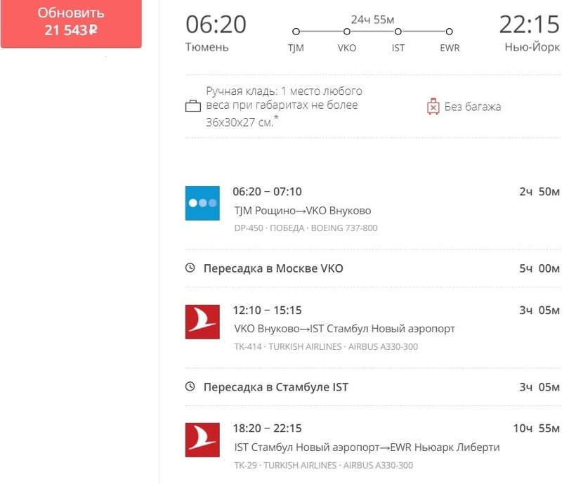 Авиабилеты по приемлемым ценам на рейсы с двумя пересадками за месяц и более до поездки найти вполне реально. Такой вариант советую рассматривать в том случае, если на нужные даты у «Аэрофлота» не найдете дешевых билетов. Например, можете совершить полет с авиакомпаниями «Победа» и Turkish Airlines. Лайнеры авиаоператоров доставят до места назначения за сутки. В общей сложности на стыковки в Москве и Стамбуле уйдет 8 часов.