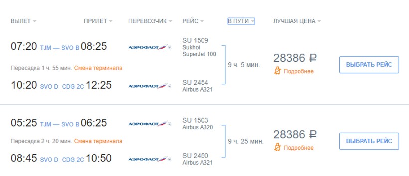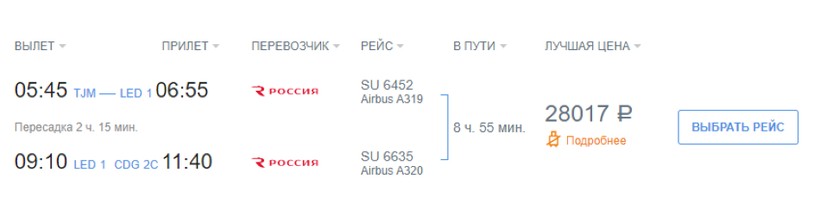 Крупнейший российский перевозчик летает в Париж со стыковками в Москве или Санкт-Петербурге. У него удобное расписание, есть много вылетов. Быстрее всего добираться транзитом через московский аэропорт Шереметьево, тогда продолжительность полета может составлять всего 9 часов!