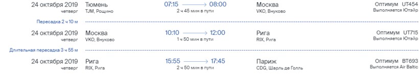 По маршруту предусмотрено две стыковки, в Москве и в Риге. До латвийской столицы вы долетите с Utair, затем пересядете на самолет Air Baltic. Удобно, что заново регистрироваться не нужно. Однако, если до середины ноября 2019 года данные рейсы будут ежедневно, то затем такой вариант будет невозможен по субботам, а в конце месяца еще и по вторникам. Покупать билеты я рекомендую заранее, недели за 2 или 3 до отправления, тогда можно улететь 19000 рублей (багаж включен).