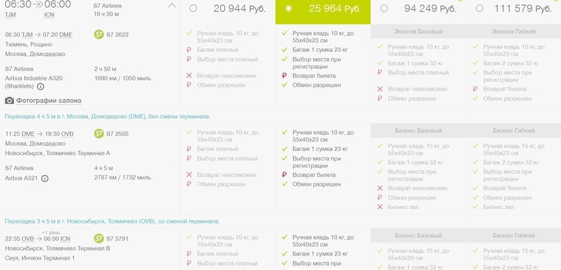 По багажу и ручной клади немного поясню. На всех собственных авиарейсах компании действует штучная система провоза регистрируемого багажа и ручной клади, то есть по количеству мест. Купив билет по тарифу, который я порекомендовала, бесплатно провезете по 1 месту ручной клади и багажа. Они будут ограничены по весу 10 и 23 кг соответственно. Также стоит знать, что детям в возрасте от 2 до 12 лет предоставляется абсолютно такая же норма бесплатного провоза регистрируемого багажа, как для взрослых пассажиров. Более дешевый способ попасть в столицу Южной Кореи — авиапутешествие с S7. Билеты только туда — от 21000 рублей (за месяц). На дорогу придется потратить 19,5 ч. (стыковка в Домодедово — 4 ч. и Толмачево — 3 ч.). Для маршрута Тюмень — Москва — Новосибирск — Сеул у компании предусмотрено 4 тарифа — два в экономический и столько же в бизнес-класс. Выбирайте тариф только с нужными опциями и не переплачивайте. Например, если купите «Эконом Гибкий», то полетите с багажом (до 23 кг) и ручной кладью (до 10 кг). Плюс выберете бесплатно место в салоне самолета.