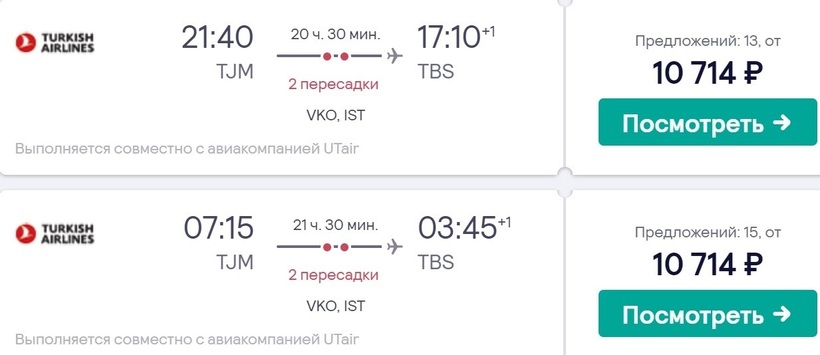 Из Тюмени в столицу Грузии есть вариант добраться только с двумя пересадками (прямых рейсов нет). Одним из самых бюджетных вариантов будет выбрать в роли перевозчика а/к Turkish Airlines (совместно с «ЮТэйр»). В среднем, в дороге проведете 21 час (есть два варианта перелета — утренний и вечерний). Авиабилет за пару дней до вылета самолета купите за 10700 рублей (обратный обойдется примерно в такую же сумму).