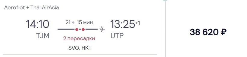 В Паттайю, город в Таиланде на берегу живописного Сиамского залива, из Тюмени можно добраться только транзитными рейсами. Прямые лайнеры по данному маршруту авиаперелеты не совершают. С ведущим российским авиаоператором «Аэрофлот» и тайским перевозчиком Thai AirAsia до места назначения доберетесь за 21 час. Из этого времени на стыковку в Москве уйдет 3,5 часа, на Пхукете — около 4 часов. Стоимость авиабилетов только туда — от 38600 рублей (за три месяца и более). Если купите сразу проездные документы и в обратную сторону, получите неплохую скидку.