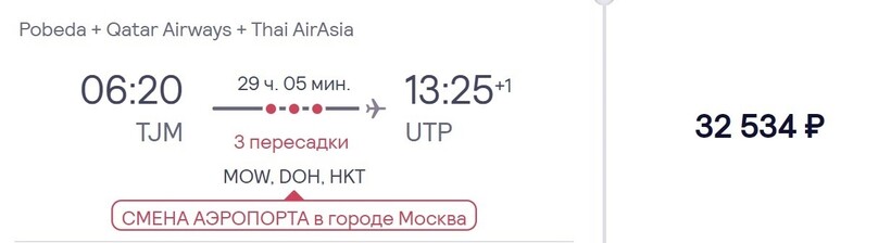 Вторая стыковка в Дохе (воздушный порт Хамад) продлится 2 ч., третья — на Пхукете — около 5 ч. Всего в пути проведете сутки и пять часов.
