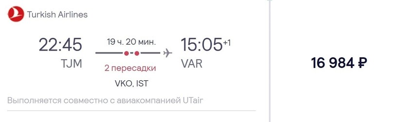 В довольно крупный болгарский портовый город-курорт Варну из Тюмени прямым лайнером добраться возможности нет. Есть только транзитные рейсы с одной и более пересадками. Летом и в так называемый бархатный сезон (до середины октября) количество транзитных перелетов в два-три раза больше, чем в остальные периоды. Например, можете рассмотреть вариант перелета с авиакомпаниями «ЮТэйр» и Turkish Airlines. По времени авиапутешествие займет 19,5 ч. Вариант перелета предполагает две стыковки. Первая будет в Москве (аэропорт Внуково — около 5 ч.), вторая — в Стамбуле (Новый аэропорт — 7,5 ч.). За 2 месяца до вылета можно купить билеты только туда за 17000 рублей. Это минимальная цена, которую предлагают авиаперевозчики.
