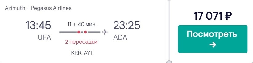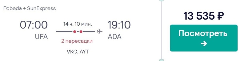 Рейсы Уфа — Адана осуществляет только одна авиакомпания - Победа. Минимальная стоимость билета составит 41 625 рублей.