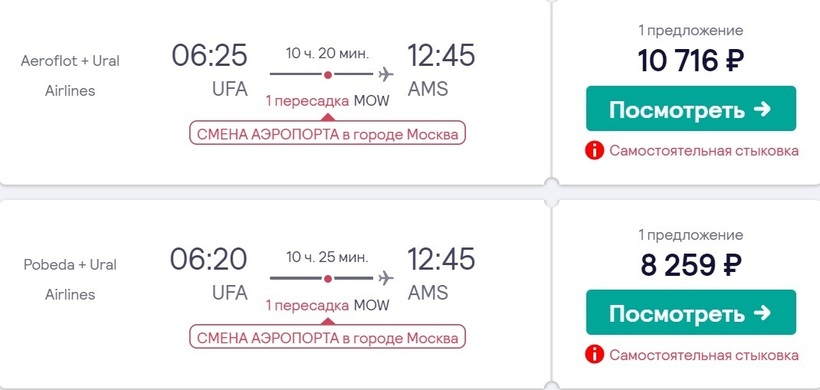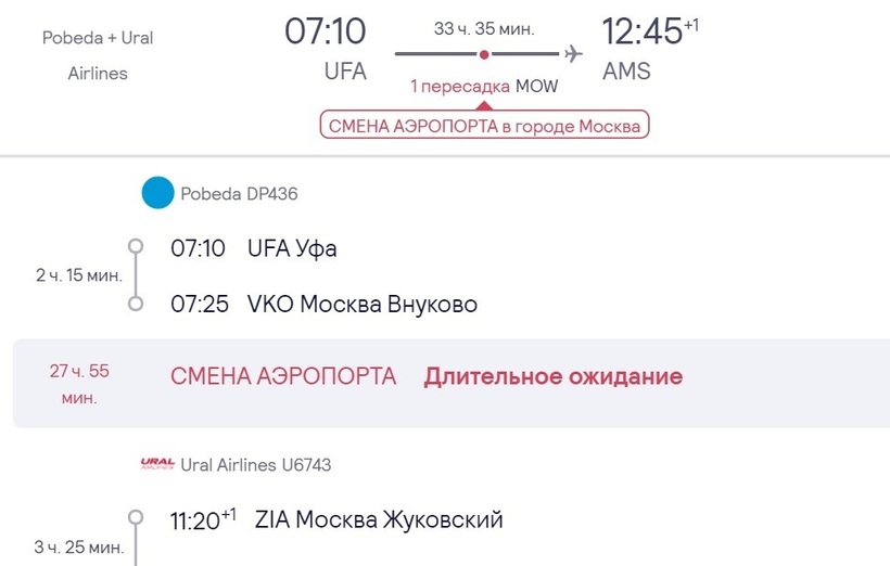 Это не единственный способ попасть в столицу Нидерландов. Можно лететь составным рейсом, например, с «Аэрофлотом» и «Уральскими авиалиниями» или с «Победой» и «Уральскими авиалиниями». Билеты за месяц до вылета самолета можно купить в среднем за 8–11 тысяч, а добраться до места за 10,5 ч. Большой минус заключается в том, что в Москве нужно сменить аэропорт (на это дается примерно 4,5 ч.). Можно не успеть, учитывая столичные пробки. Да и на такси придется прилично потратиться.