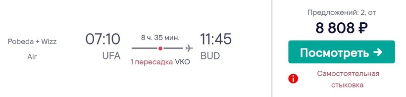 Если у меня ограничен бюджет на поездку, то тогда лечу до столицы Венгрии с лоукостерами «Победа» и Wizz Air. Это более дешевый способ авиапутешествия, чем с традиционными компаниями. В среднем весь путь занимает 8,5 ч. Пересадка в московском аэропорту Внуково, на нее дается 3,5 ч. Предстоит самостоятельная стыковка. Это значит, что вам нужно забрать свой багаж и заново пройти регистрацию, паспортный контроль и досмотр. Времени на это предостаточно, даже успеете перекусить в одном из многочисленных кафе аэровокзала.