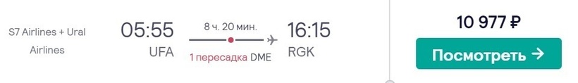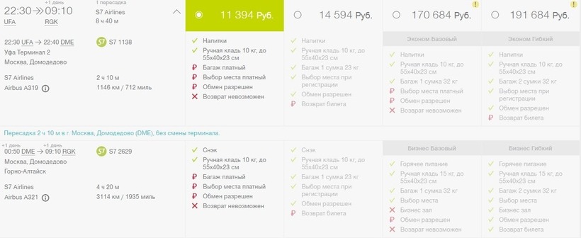 Также можно совершить перелет только на лайнерах компании S7. Самолеты авиаоператора совершают транзитные рейсы по маршруту Уфа — Москва — Горно-Алтайск каждый день, что удобно. В дороге проведете от 8,5 до 14 часов (расписание нестабильное). На пересадку в Домодедово уйдет от 2 до 7 часов. Авиабилеты купите минимум за 11300 рублей. Цена актуальна за месяц и более до вылета.