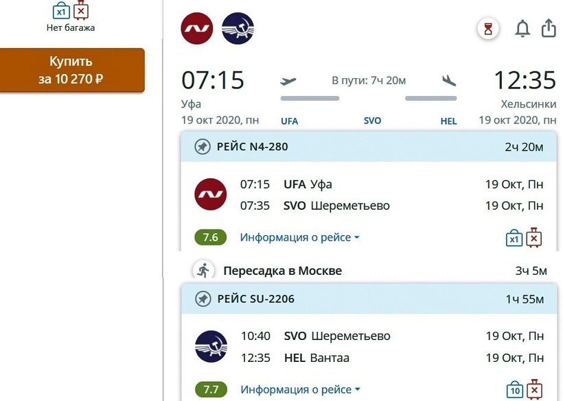 | Finnair (AY 7506) Airbus А320 | 23:55 Уфа (UFA) | 3 ч. 15 мин | 01:10 Хельсинки (HEL) | 8 октября |