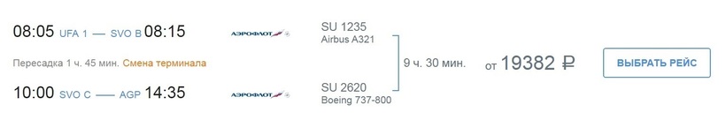 Оптимальный вариант для авиапутешествия в этот испанский город по времени в пути, стоимости билетов — перелет с «Аэрофлотом». Именно на авиарейсы этой компании я и купила билеты. Выбрала перелет продолжительностью 9,5 ч. (вместе со стыковкой). Это, кстати, самый оперативный способ попасть из Уфы в Малагу. Отмечу и удобное расписание этих рейсов. Отправление утром, прибытие на место после обеда.