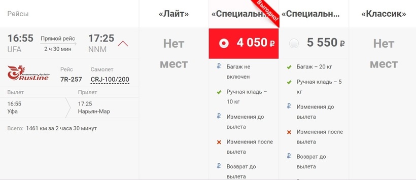 Это минимальная цена, даже если бронировать за несколько месяцев вперед. У авиакомпании одноклассовая компоновка салона, есть только экономкласс, который представлен двумя тарифами с разным набором опций. Рейсы выполняются на самолетах Bombardier CRJ200. Вылеты осуществляются из международного аэропорта Уфы им. Мустая Карима. До него советую доезжать на автобусе № 110 (от остановки «Гостиный двор»).