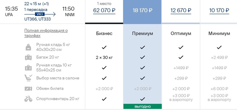 Если купить авиабилеты сразу туда-обратно — можно сэкономить до 10% от их начальной стоимости. А/к предлагает три тарифа в экономкласс: