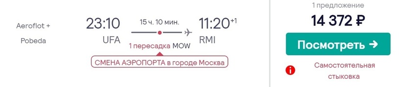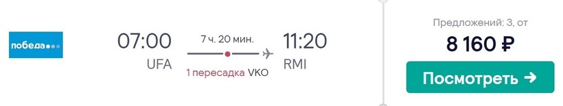 Это оптимальный вариант по времени в пути и стоимости билетов, который я в итоге и выбрала для перелета в этот итальянский курортный город. Лоукостер «Победа» доставит до конечного пункта за 7,5 часов. Причем время стыковки во Внуково — 1 час и 40 минут. Также у авиакомпании вполне удобное расписание: отправление из Уфы утром, прибытие в Римини до обеда (по местному времени). Не забывайте, что разница во времени между городами составляет четыре часа. Билеты — от 8100 рублей (за 1,5 месяца).