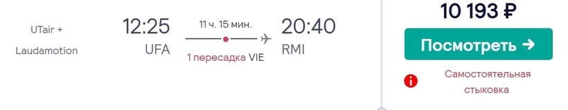 Также учтите такой момент, что у авиакомпаний нет договоренности о пересадке — стыковка самостоятельная. В аэропорту столицы Австрии нужно забрать и заново сдать багаж, пройти регистрацию на следующий рейс до Римини. Попасть в международный аэропорт Уфы им. Мустая Карима (он единственный в городе) можно на автобусе № 110.