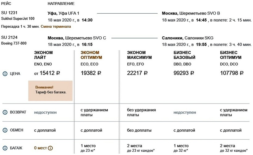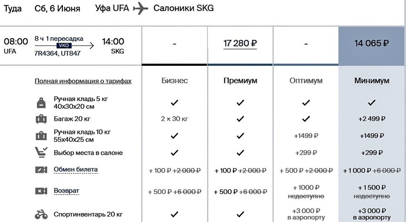 S7 и Aegean не предлагают тариф с ручной кладью, поэтому удешевить перелет за счет багажа не удастся. Преодолеть маршрут с Utair можно во все дни недели, за исключением понедельника и пятницы. С двухчасовой пересадкой во Внуково перелет длится 8 ч. С мая по сентябрь могу рекомендовать путешествие с этим российским оператором, потому что он в летний период предлагает одни из самых дешевых билетов по направлению: только туда с багажом обойдутся в 17500–18500 ₽, если купить и в обратную сторону — от 32000 ₽. Стоимость полета с ручной кладью ниже на 3000 ₽.