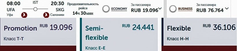 Стоимость авиабилетов на самолет Уфа — Салоники в одну сторону (“туда”) колеблется от 28 441 до 31 435 рублей, в среднем купить билет можно за 29 938 рублей.