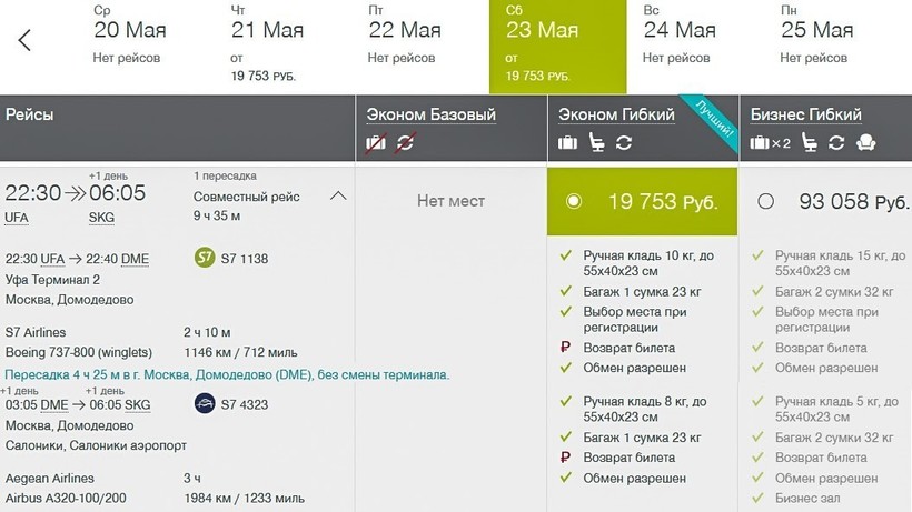 Советую лететь с S7 и Aegean в мае, июле-сентябре по воскресеньям, а в июне еще и по пятницам и субботам, когда с пересадкой в Домодедово в 4,5–5 часов путешествие занимает 10 ч. По стоимости авиабилетов данные компании могут составить конкуренцию в летнее время вышеописанному российскому перевозчику: на протяжении сезона полет туда стоит 20000–21500 ₽, в обе стороны — от 37500 ₽. Бизнес-класс — от 93000 ₽.