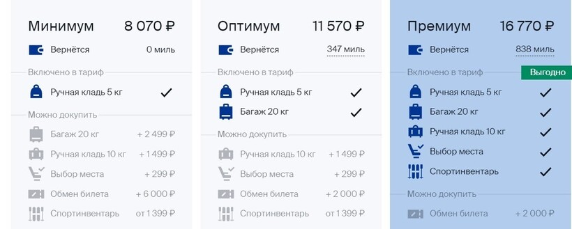 Авиаоператор предлагает на выбор четыре тарифных плана: три — в экономический класс обслуживания и один — в более премиальный бизнес-класс. Самый дешевый авиатариф называется «Минимум», и он оправдывает свое название. Опций немного: авиаперелет, провоз ручной клади (есть ограничение по весу — 5 кг). В тариф «Оптимум» включены такие услуги, как перелет, возможность взять в полет не только ручную кладь, но и багаж (ограничение по весу — 20 кг). Самый продвинутый тарифный план эконом-класса у «ЮТэйр» называется «Премиум» и включает: