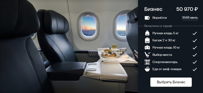 Авиабилет в бизнес-класс можно приобрести за 51000 рублей (цена актуальна за две недели и более).