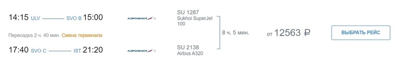 Попасть в крупнейший город Турции Стамбул из Ульяновска можно только транзитом, например, можете рассмотреть вариант авиапутешествия с «Аэрофлотом». Самолеты главного перевозчика страны летают в этот турецкий город со стыковкой в Москве. Хабом авиаоператора в столице РФ является аэропорт Шереметьево. Аэровокзальный комплекс большой, стильный, современный, с хорошо отлаженной инфраструктурой. Продолжительность максимально оперативного рейса у авиакомпании составляет 8 часов. На стыковку в Москве уйдет 2,5 часа. Полетите по единому билету, проходить повторно регистрацию в Шереметьево не нужно. Помимо этого, у авиаоператора есть и другие варианты перелетов, с более длительной стыковкой в Москве. Например, можно потратить на дорогу 20 часов, тогда длительность пересадки в Москве будет 14,5 ч. За это время можно съездить на экскурсию в город (к примеру, совершить променад по Красной площади или Старому Арбату). Вне зависимости от того, какой вариант перелета выберете, стоимость билета будет одинаковой — от 12500 рублей. У «Аэрофлота» стабильные цены, что за полтора месяца, что за полгода до вылета самолета.