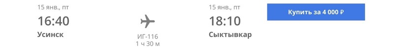 Это самый дешевый вариант. Стоимость перелета составит около 9000 рублей (при покупке билетов за месяц). Лететь предстоит со стыковками в Сыктывкаре и Москве. Первая часть пути проходит с Komiaviatrans, рейс вечерний.