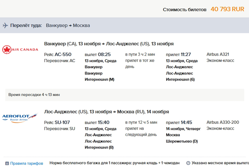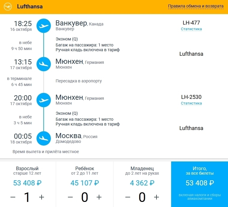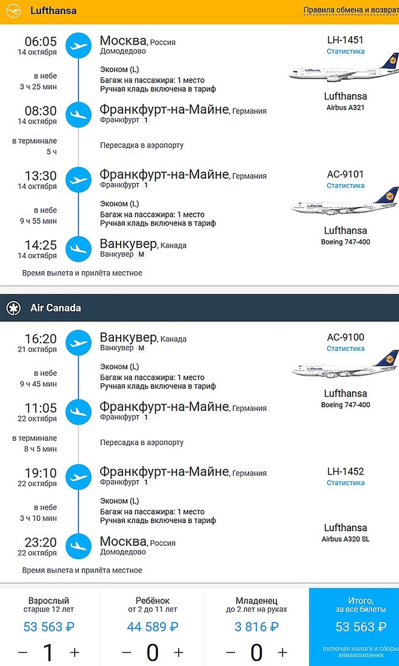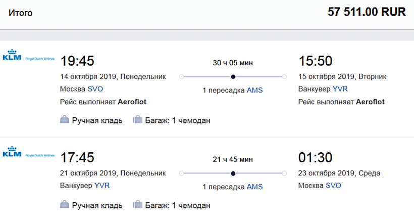 Но я советую купить билеты сразу на рейс Москва — Ванкувер и на обратный рейс Ванкувер — Москва, ведь за оба рейса вы заплатите — (внимание!) также 53 тысячи рублей (опять же, при покупке за 2 месяца).