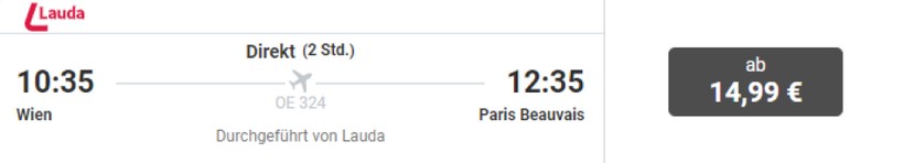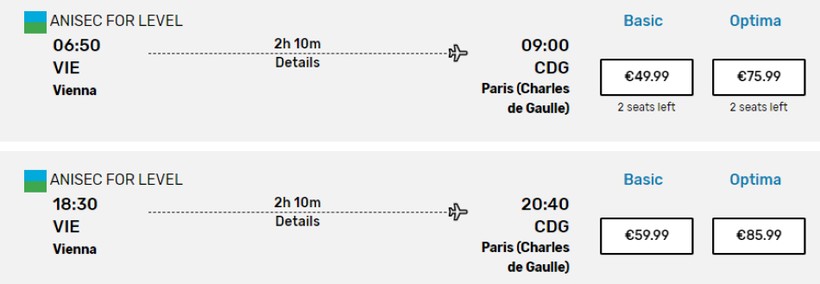Авиасообщение между Веной и Парижем обеспечивают десятки операторов, они осуществляют как прямые (их продолжительность составляет 2 часа), так и транзитные рейсы. Оптимальные варианты полета предлагают следующие перевозчики: