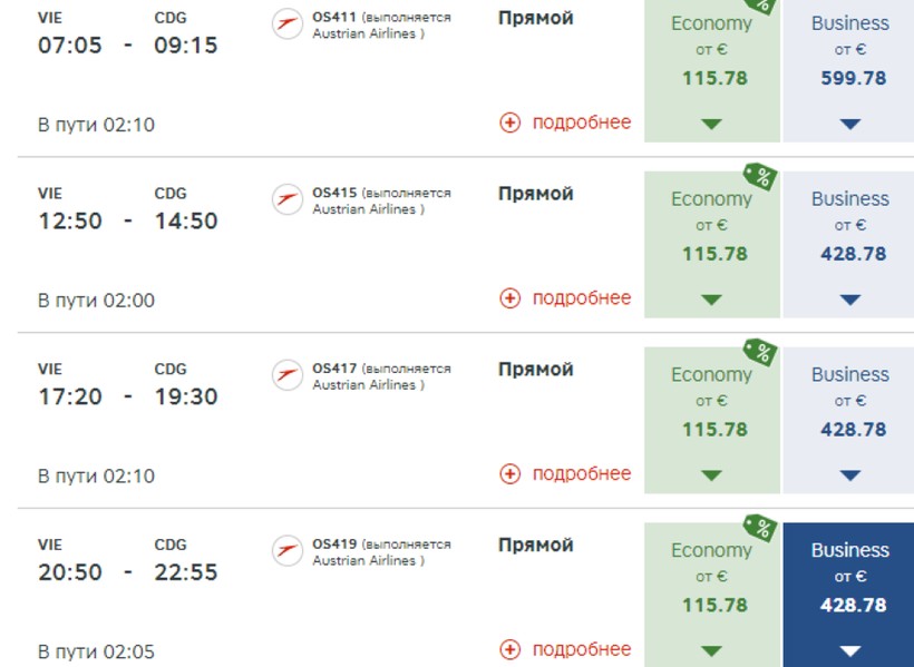 | Austrian (OS 367) Airbus А320 | 17:20 Вена (VIE) | 2 ч. 00 мин | 19:20 Париж (CDG) | 26, 27, 28, 29, 30 ноября, 1, 2, 3, 4, 5, 6, 7, 8, 9, 10, 11, 12, 13, 14, 15 декабря, … |