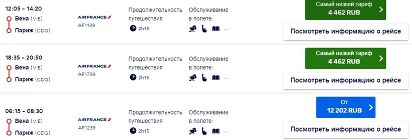 AirFrance осуществляет перевозки в Париж чуть реже — предусмотрено 3 ежедневных рейса, два утром и один вечером.
