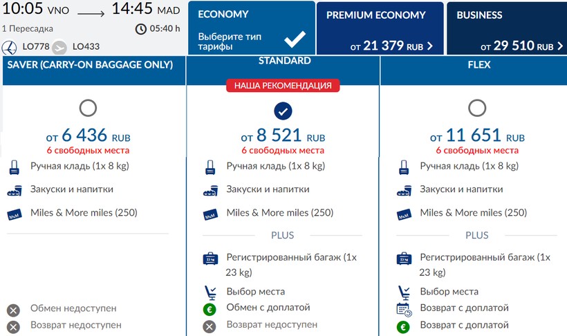 Из перевозчиков, выполняющих рейсы круглогодично, оптимальный вариант авиаперелета предлагает LOT. Во-первых, потому что летают его лайнеры по направлению ежедневно. Во-вторых, время в пути непродолжительное, и билеты относительно недорогие. Именно с этой авиакомпанией я и предпочитаю преодолевать маршрут с ноября по апрель. В период, когда беспересадочные авиарейсы выполняет лоукостер, я лечу с ним, потому что полет с Ryanair максимально быстрый, а билеты только с ручной кладью самые дешевые. Любителям путешествовать в бизнес-классе советую выбрать перелет на крыльях «Брюссельских авиалиний», у которых цена авиабилетов для данного класса ниже на 8500 ₽, чем у LOT, и на 4000 ₽, чем у Lufthansa.