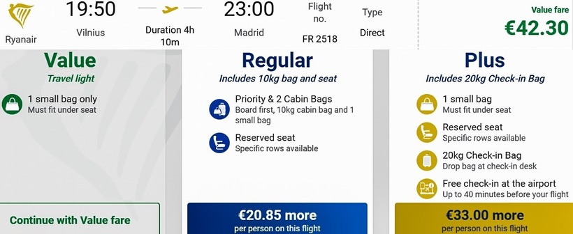 С конца марта по конец октября между столицами Литвы и Испании беспересадочные авиарейсы выполняет лоукостер Ryanair. Совершаются полеты всего дважды в неделю — по вторникам и пятницам. Хотя расписание не самое удобное, но я иногда предпочитаю летать на крыльях этой бюджетной авиакомпании. Во-первых, потому что время в пути составляет всего 4 часа. Во-вторых, потому что у Ryanair можно купить дешевые билеты: полет с ручной кладью только туда обойдется в среднем в 3000–4500 ₽, в обе стороны — от 6500 ₽.