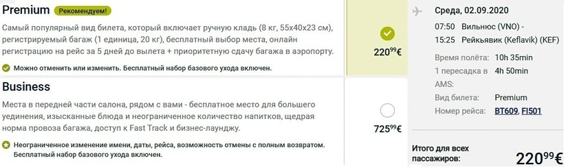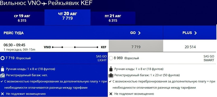 Любителям путешествовать налегке в период с ноября по апрель однозначно рекомендую лететь по направлению с SAS, так как из описанных авиаперевозчиков, выполняющих рейсы в осенне-зимний период, у скандинавского оператора самые недорогие билеты. В весенне-летнее время конкуренцию SAS может составить airBaltic, но, напомню, перелет с балтийской авиакомпанией занимает на 5 ч. больше времени. Я летала в Исландию в марте также в SAS, потому что стоимость авиабилетов туда-обратно с багажом была у данного оператора ниже на 18000 ₽, чем у airBaltic и Icelandair, на 5000 ₽, чем у Finnair, и на 6000 ₽, чем у Lufthansa. Пассажирам, предпочитающим преодолевать путь в бизнес-классе, выгоднее всего путешествовать с Lufthansa.